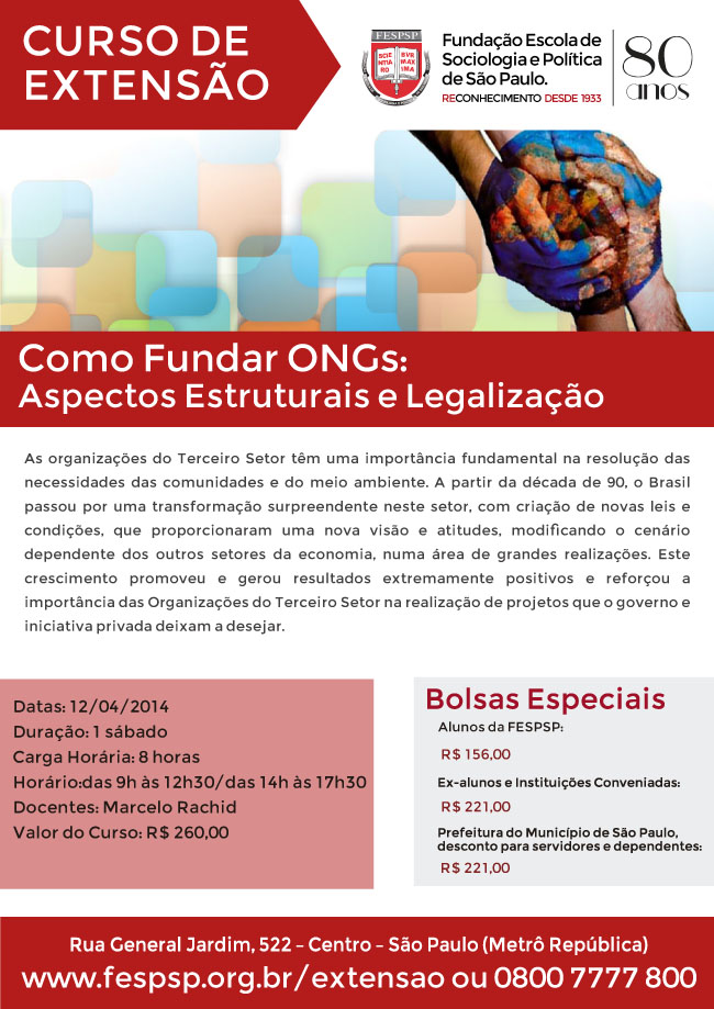 Conforme divulgado anteriormente, a Alavanca Social, através da parceria com a Fundação Escola de Sociologia e Política de São Paulo – FESP-SP, irá ministrar diversos cursos relacionados à ações no Terceiro Setor. Os cursos serão ministrados no sistema de módulos e tratarão dos assuntos: Criação de Ongs, Elaboração de Projetos, Captação de Recursos e Gestão/Planejamento, e deverão acontecer nos meses de abril, maio, junho e agosto de 2014, com duração de 08 horas (01 dia) para cada um deles.