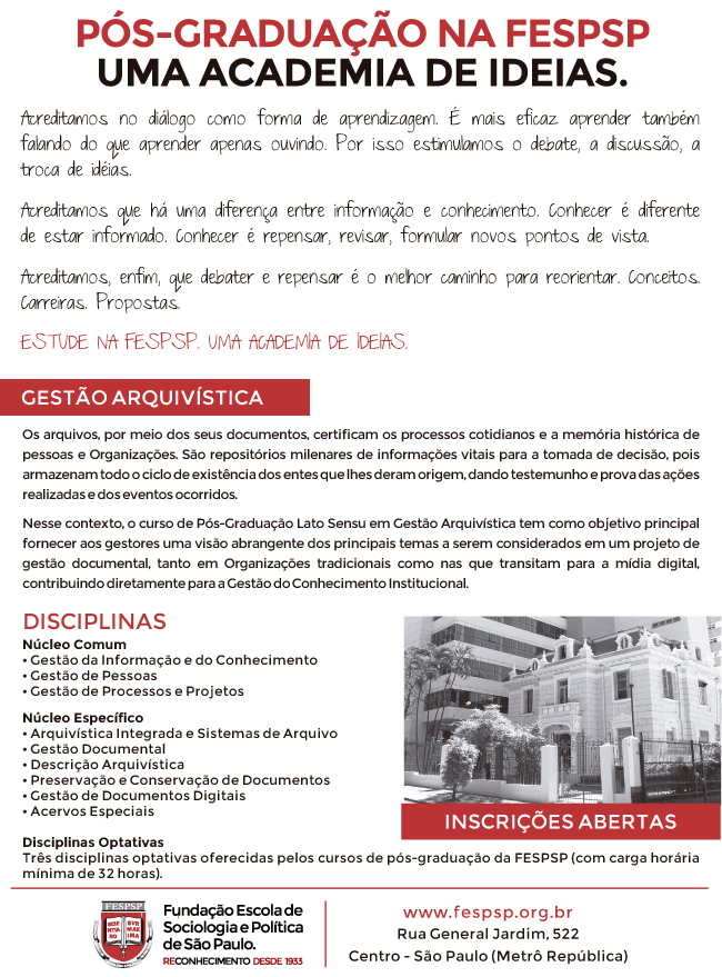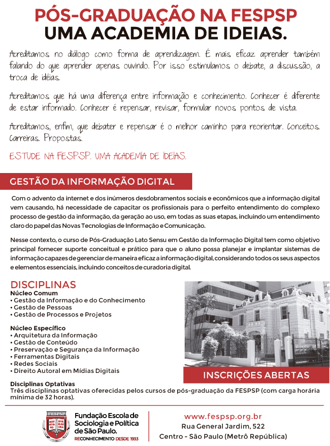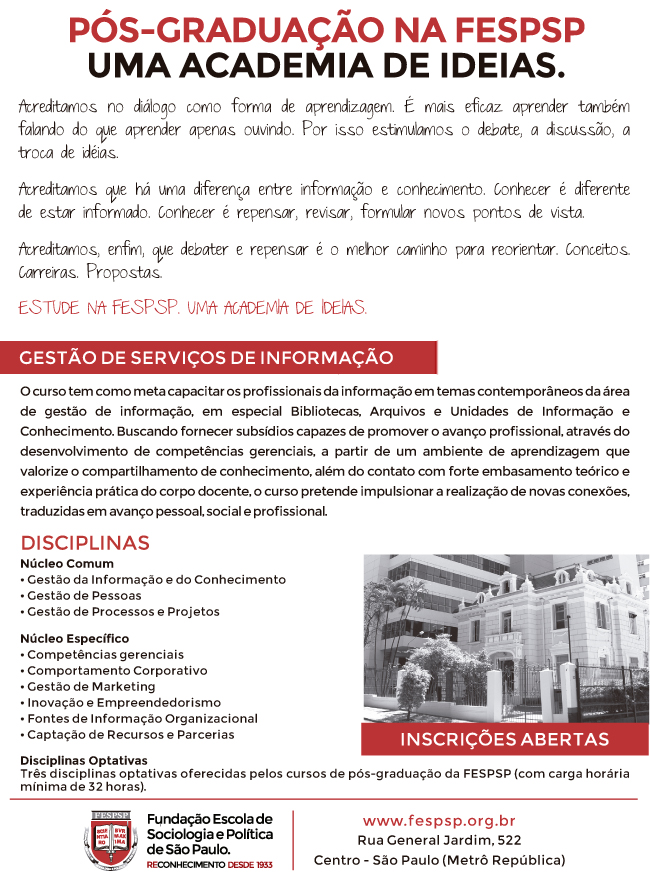 Faça Pós-Graduação em Gestão de Serviços de Informação na FESPSP, as inscrições estão abertas,http://www.fespsp.org.br/pos-graduacao/gestao-de-servicos-de-informacao