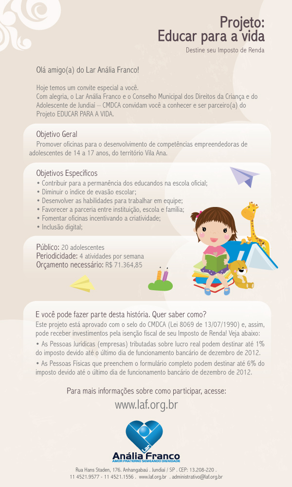 O LAR ANÁLIA FRANCO de Jundiaí, há 100 anos realizando um trabalho diferenciado na educação e melhores condições da comunidade, está colocando em ação o Projeto EDUCAR PARA A VIDA, que tem como principal objetivo “Promover oficinas para o desenvolvimento de competências empreendedoras de adolescentes de 14 a 17 anos, do território Vila Ana”.