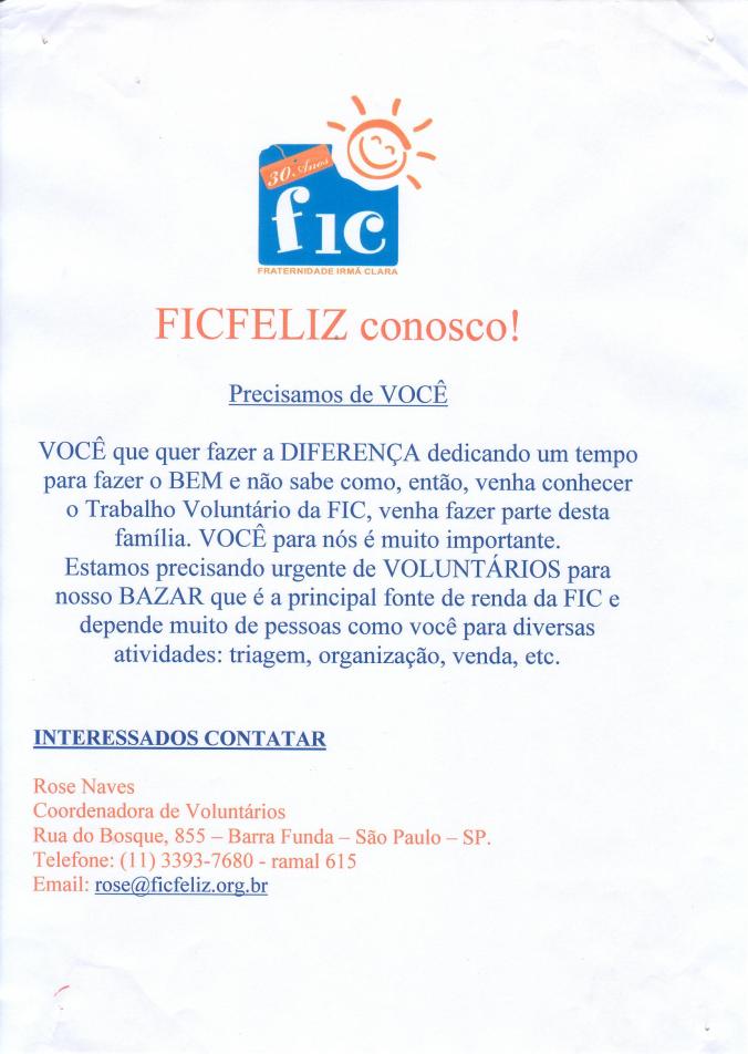 • Sempre preocupada na redução de custos e evitar o desperdício, está solicitando ajuda para empresas ou pessoas que possam doar papel sulfite com somente um lado usado, pois pode ser utilizado em larga escala na instituição. Quem puder ou conhecer alguém que tenha esta condição entre em contato com Rose no telefone (11) 3393-7680 – ramal 615, ou através do site www.ficfeliz.org.br.